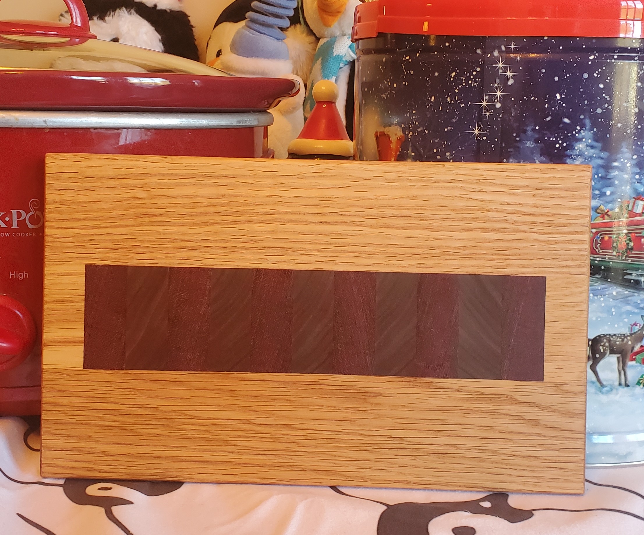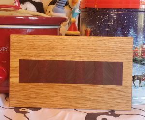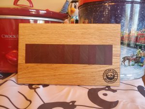 This handmade oak, purple heart, and walnut board can be used as a cheese board, a butter board, a breadboard, a small cutting board, or a beautiful decorative piece. Finished with food-grade mineral oil and beeswax, it is 100% safe for use. It measures almost 10″ x 6″.
