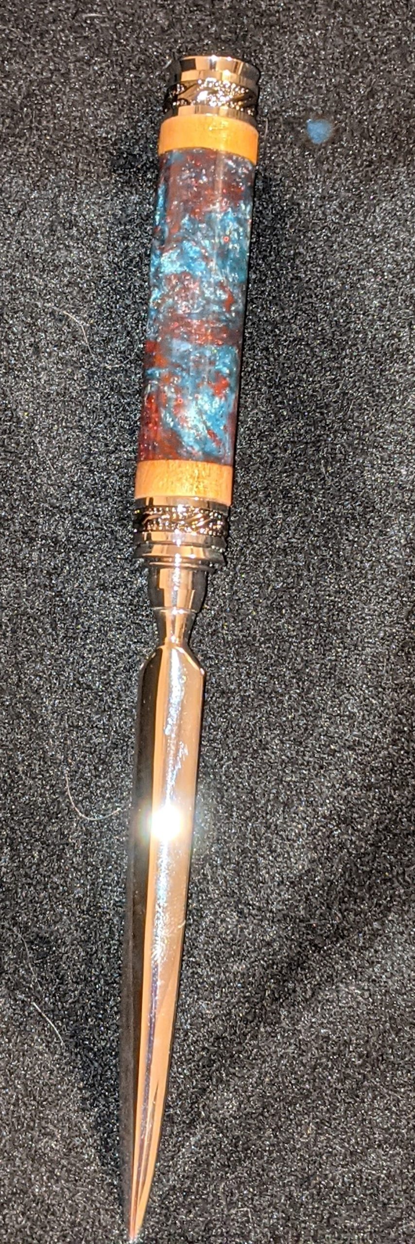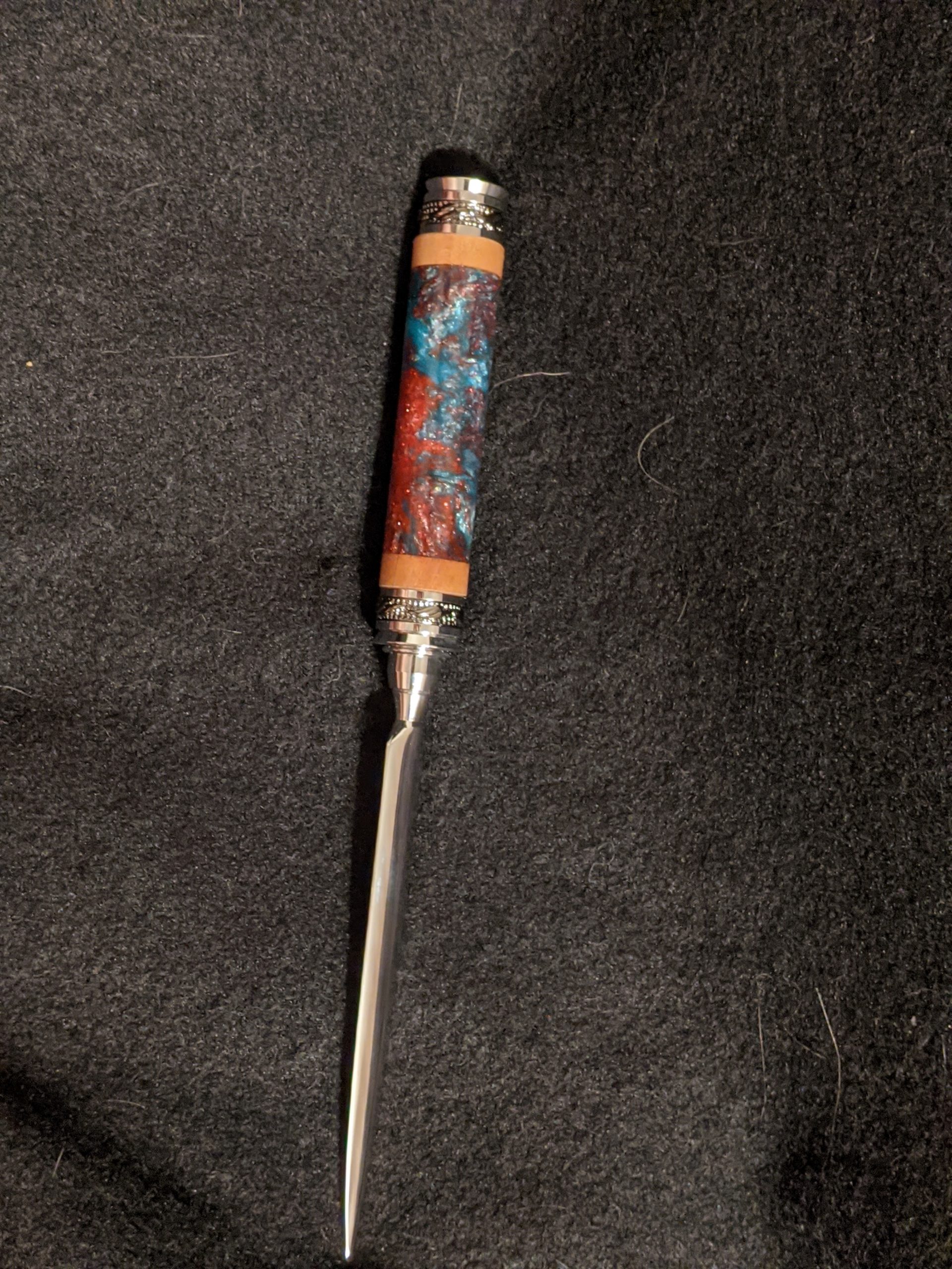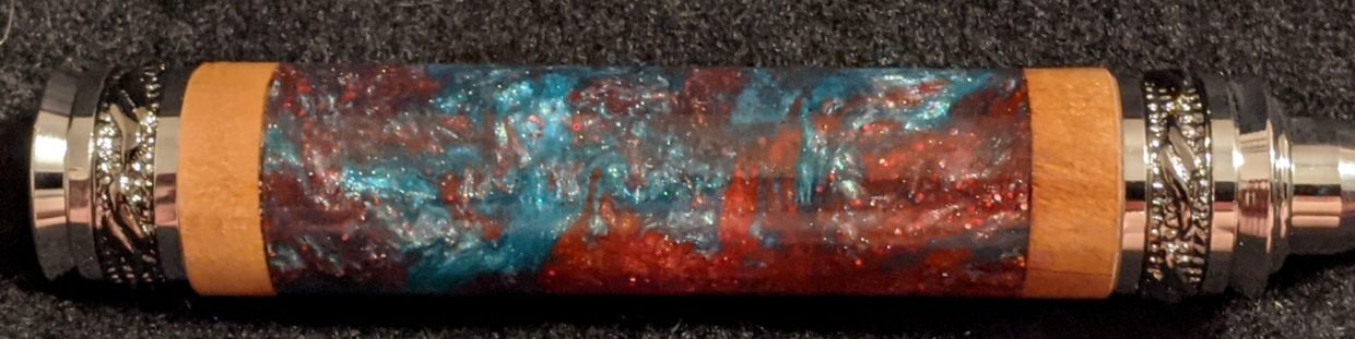 This was a commissioned piece. However, there happen to be two more in a similar maroon and teal resin and without the wood accents.