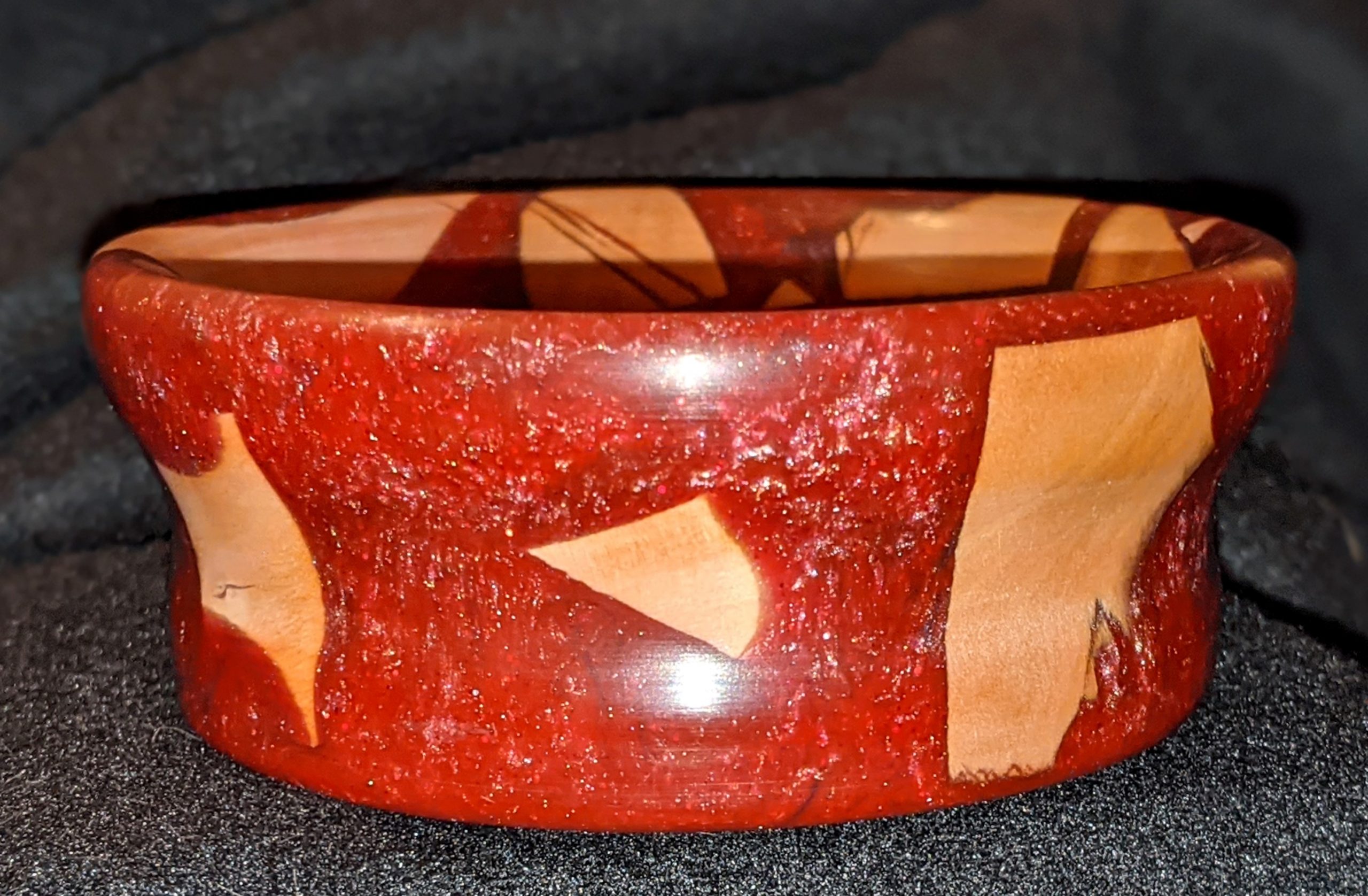 Made from randomly cut pieces of locust wood and cast in a beautiful red resin with blue accents, this small piece is a true work of art.